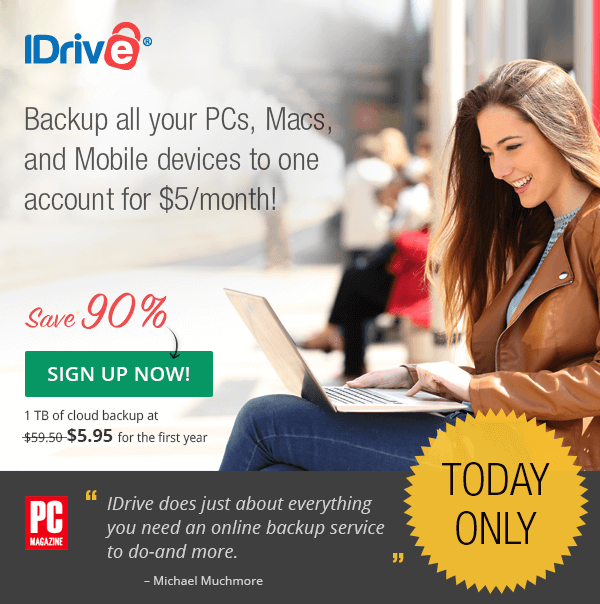 Today Only: Save 90% on IDrive, and backup all your PCs/Macs/Smartphones. Only $5.95 for the first year!